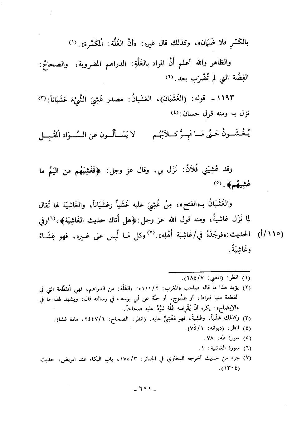 1193 - قوله: (الغَشَيَان)، الغشَيانُ: مصدر غَشِيَ الشَّيْءَ غشَيَاناً: (¬3) نزل به ومنه قول حسان: (¬4)