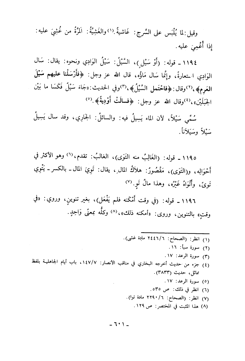 1194 - قوله: (أَوْ سَيْلٍ)، السَّيْلُ: سَيْلُ الرَادِي ونحوه: يقال: سَال الوَادِي استعارةً، وإِنَّما سَال مَاؤُه، قال الله عز وجل: {فَأَرْسَلْنَا عَلَيْهِمْ سَيْلَ الْعَرِمِ}، (¬2) وقال: {فَاحْتَمَلَ السَّيْلُ}، (¬3) وفي الحديث: "جَاءَ سَيْلٌ فَكَسَا ما بَيْن الجَبَلَيْن"، (¬4) وقال الله عز وجل: {فَسَالَتْ أَوْدِيَةٌ}. (¬5)