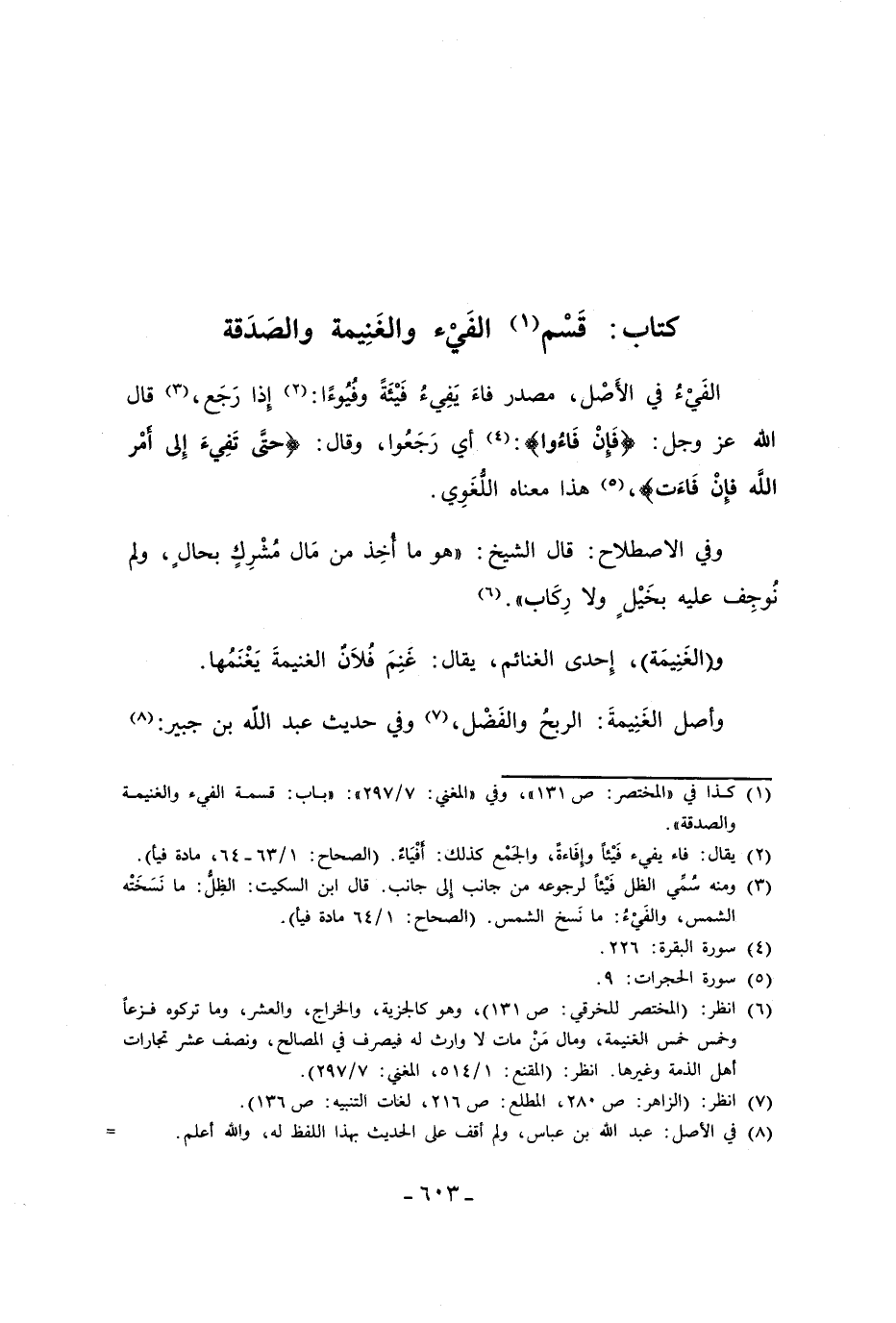 (¬1) كذا في "المختصر: ص 131"، وفي "المغني: 7/ 297 ": "باب: قسمة الفيء والغنيمة والصدقة".