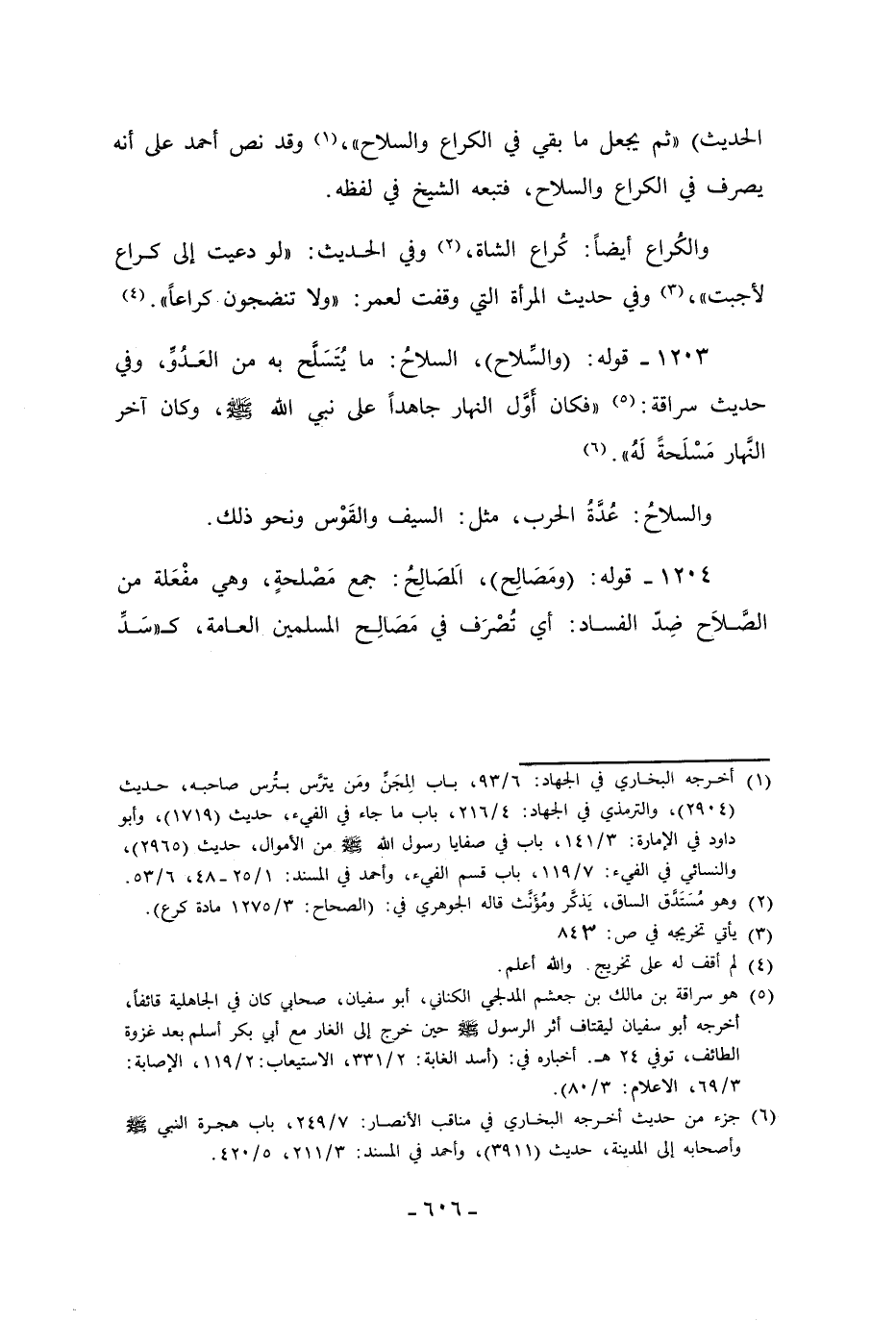 1203 - قوله: (والسِّلاح)، السلاحُ: ما يُتَسَلَّح به من العَدُوِّ، وفي حديث سراقة: (¬5) "فكان أَوَّل النهار جاهداً على نبي الله - صلى الله عليه وسلم -، وكان آخر النَّهار مَسْلَحةً لَهُ". (¬6)
