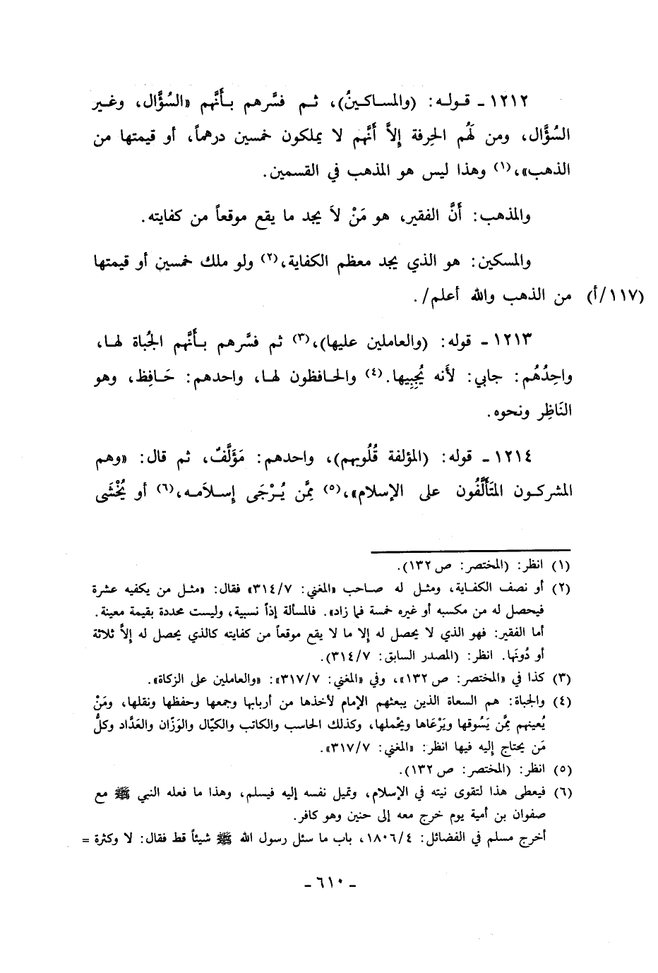 1212 - قوله: (والمساكينُ)، ثم فسَّرهم بأَنَّهم (السُؤَّال، وغير السُؤَّال، ومن لَهُم الحِرفة إِلَّا أَنَّهم لا يملكون خمسين درهماً، أو قيمتها من الذهب"، (¬1) وهذا ليس هو المذهب في القسمين.