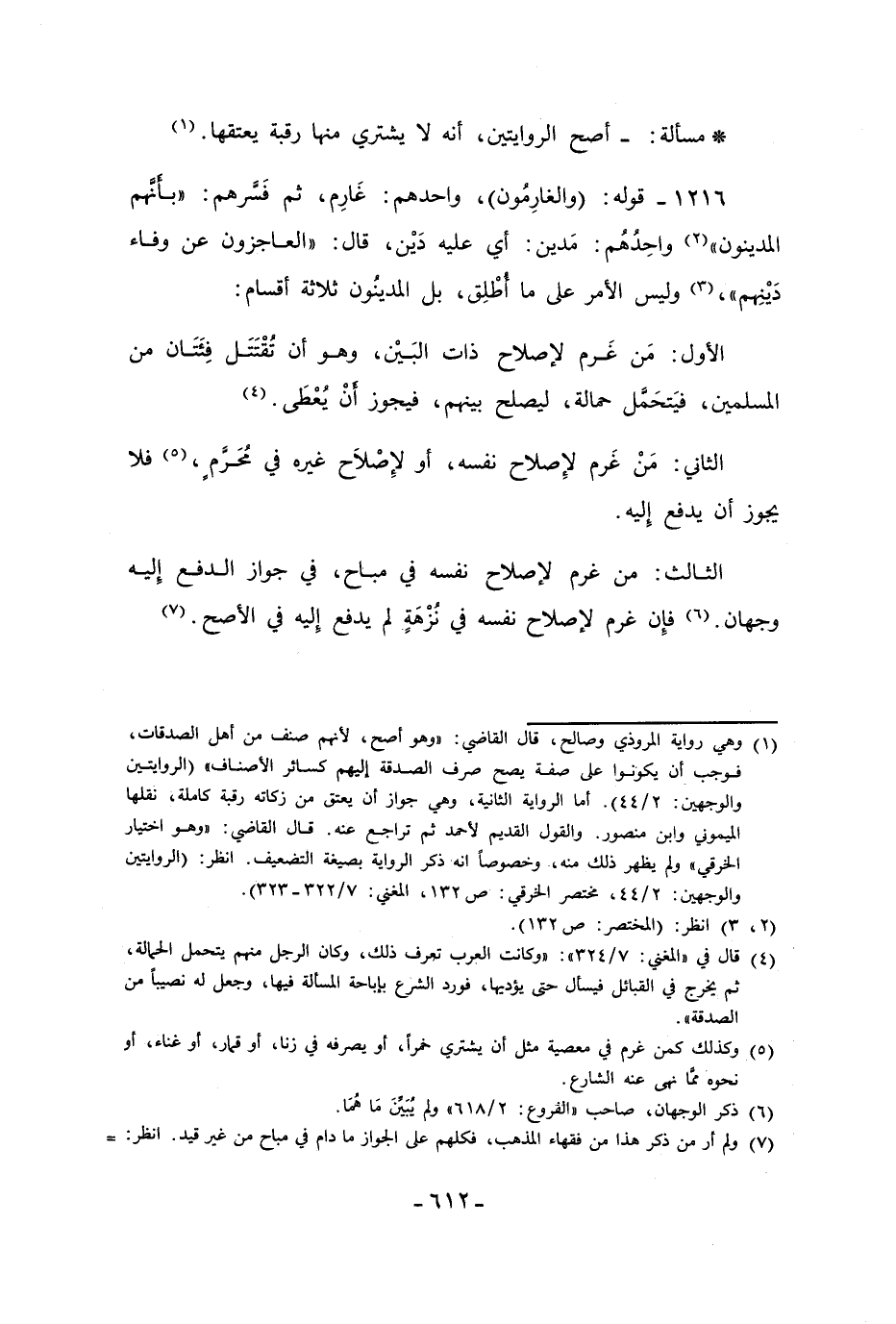 1216 - قوله: (والغارِمُون)، واحد هم: غَارِم، ثم فَسَّرهم: "بأَنَّهم المدينون" (¬2) واحِدُهُم: مَدين: أي عليه دَيْن، قال: "العاجزون عن وفاء دَيْنِهم"، (¬3) وليس الأمر على ما أُطْلِق، بل المدينون ثلاثة أقسام: