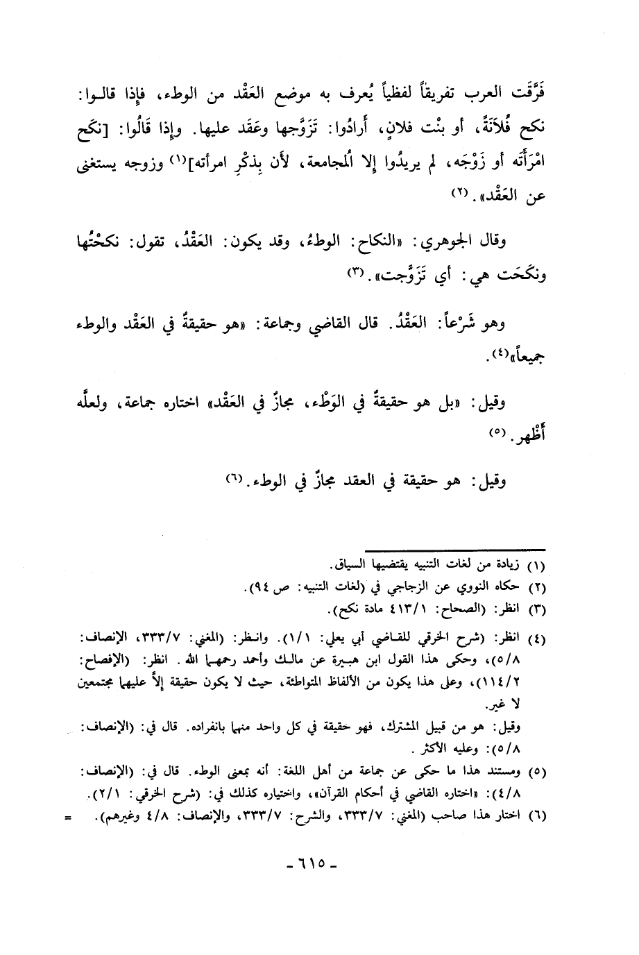 (¬5) ومستند هذا ما حكى عن جماعة من أهل اللغة: أنه بمعنى الوطء. قال في: (الإنصاف: 8/ 4): "اختاره القاضي في أحكام القرآن"، واختياره كذلك في: (شرح الخرقي: 1/ 2).
