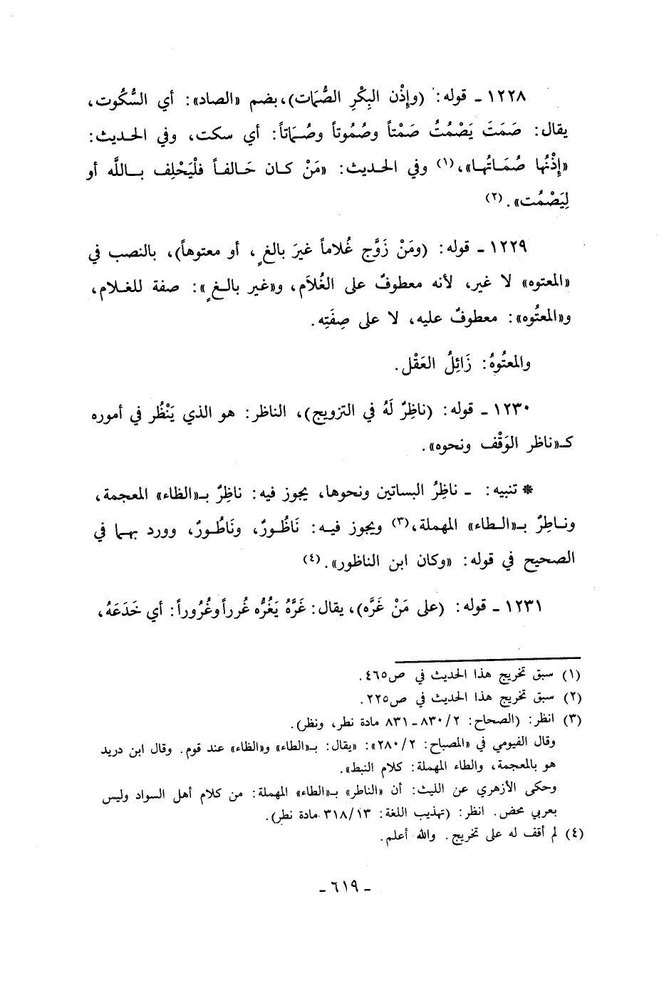 1229 - قوله: (ومَنْ زَوَّج غُلاماً غيرَ بالغٍ، أو معتوهاً)، بالنصب في "المعتوه" لا غير، لأنه معطوفٌ على الغُلاَم، و"غير بالغ": صفة للغلام، و"المعتُوه": معطوفٌ عليه، لا على صِفَتِه.