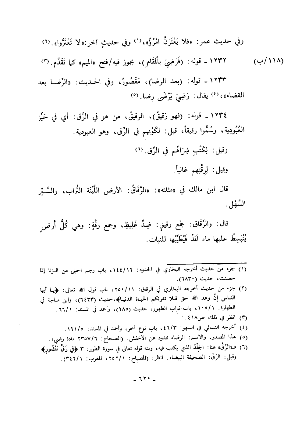 (¬6) فـ"الرَّقُ" هنا: الجِلْدُ الذي يكتب فيه، ومنه قوله تعالى في سورة الطور: 3 {فِي رَقٍّ مَنْشُورٍ} وقيل: الرَّقَ: الصحيفة البيضاء. انظر: (المصباح: 1/ 252، المغرب: 1/ 342).