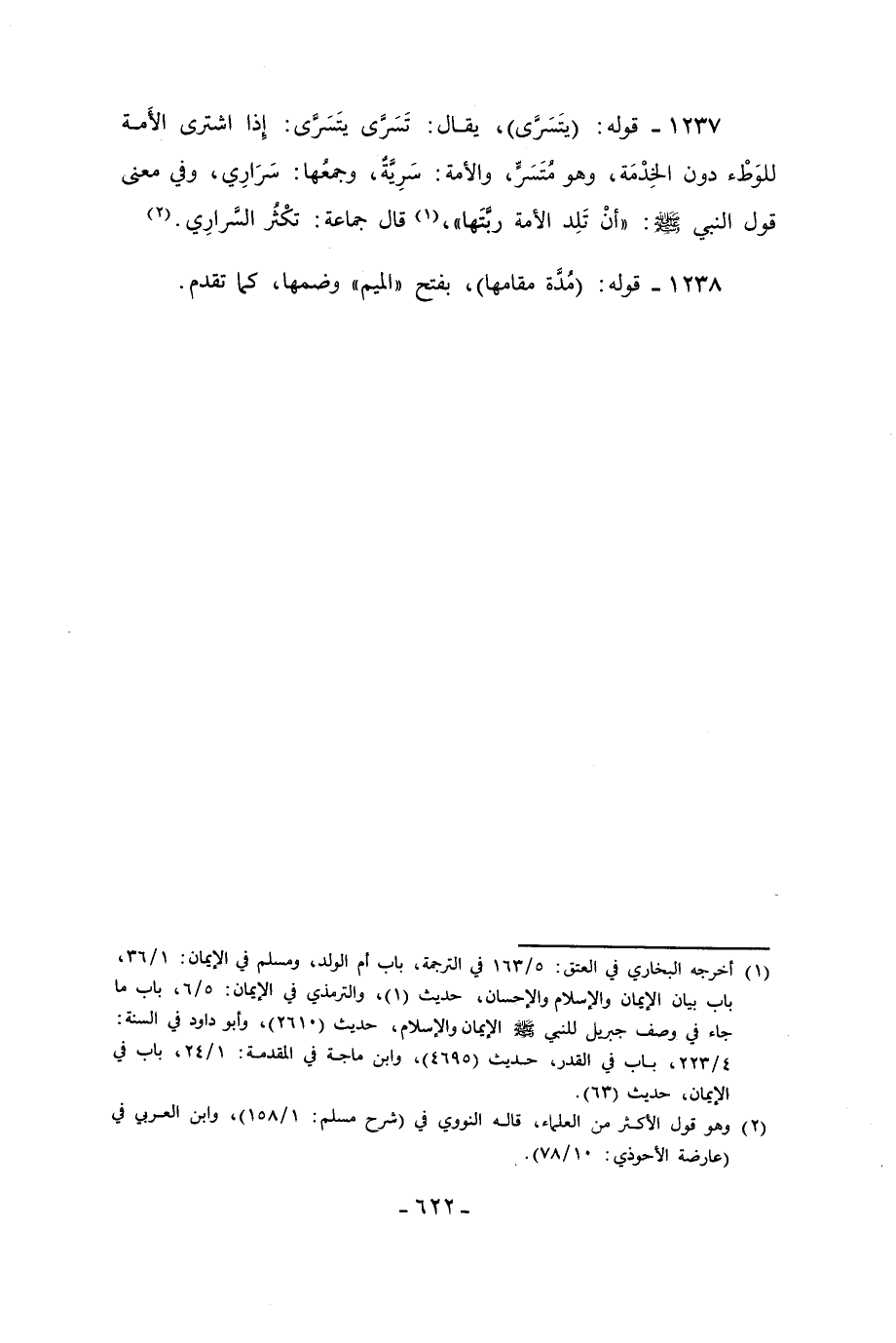 1237 - قوله: (يتَسَرَّى)، يقال: تَسَرَّى يتَسَرَّى: إِذا اشترى الأَمة للوَطْء دون الخِدْمَة، وهو مُتَسَرٍّ، والأمة: سَرِيَّةٌ، وجمعُها: سَرَارِي، وفي معنى قول النبي - صلى الله عليه وسلم -: "أنْ تلِد الأمة ربَّتَها"، (¬1) قال جماعة: تكْثُر السَّرارِي. (¬2)