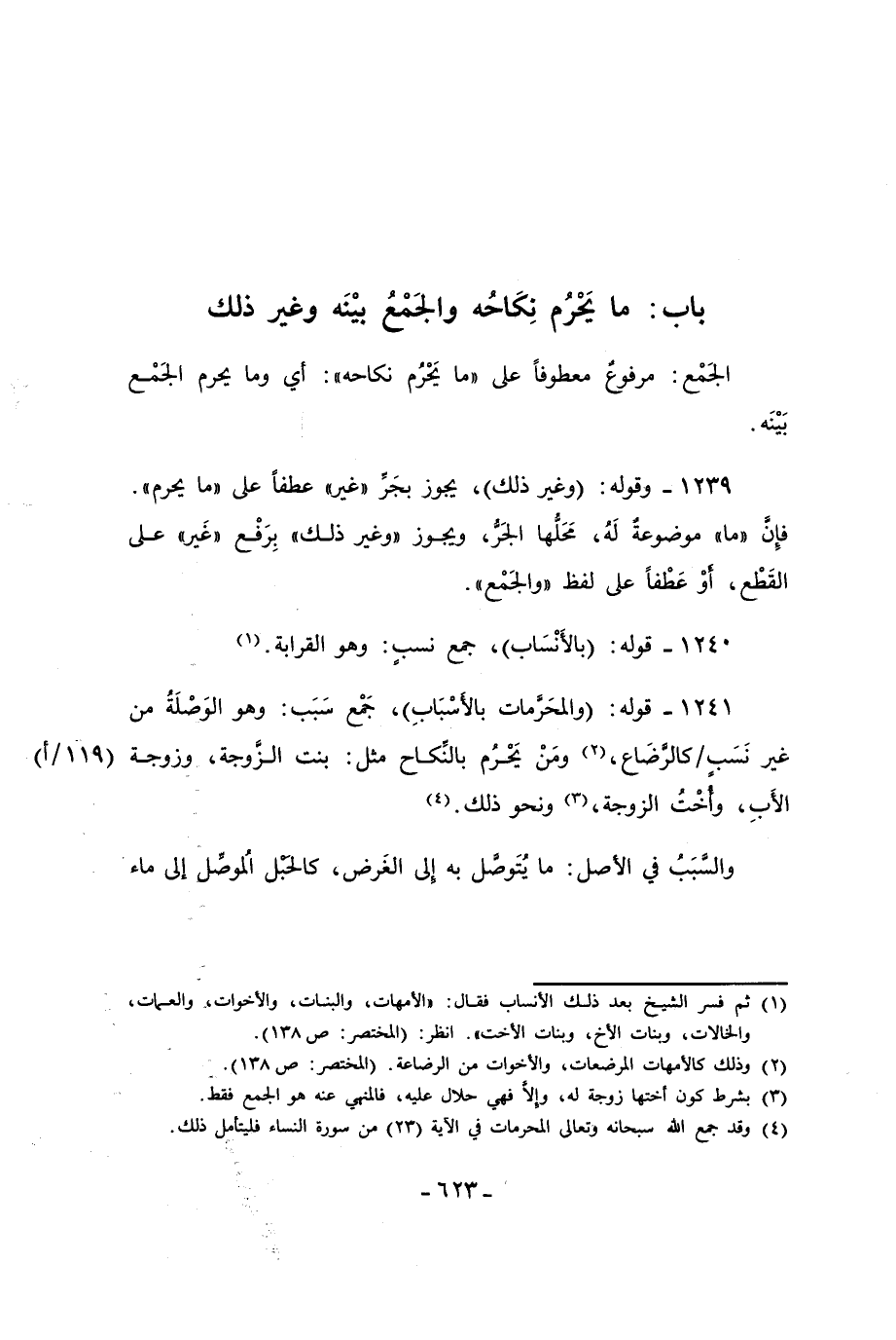 1241 - قوله: (والمحَرَّمات بالأَسْبَابِ)، جَمْع سَبَب: وهو الوَصْلَةُ من غير نَسَبٍ كالرَّضَاع، (¬2) ومَنْ يَحْرُم بالنِّكاح مثل: بنت الزَّوجة، وزوجة الأَبِ، وأُخْت الزوجة، (¬3) ونحو ذلك. (¬4)
