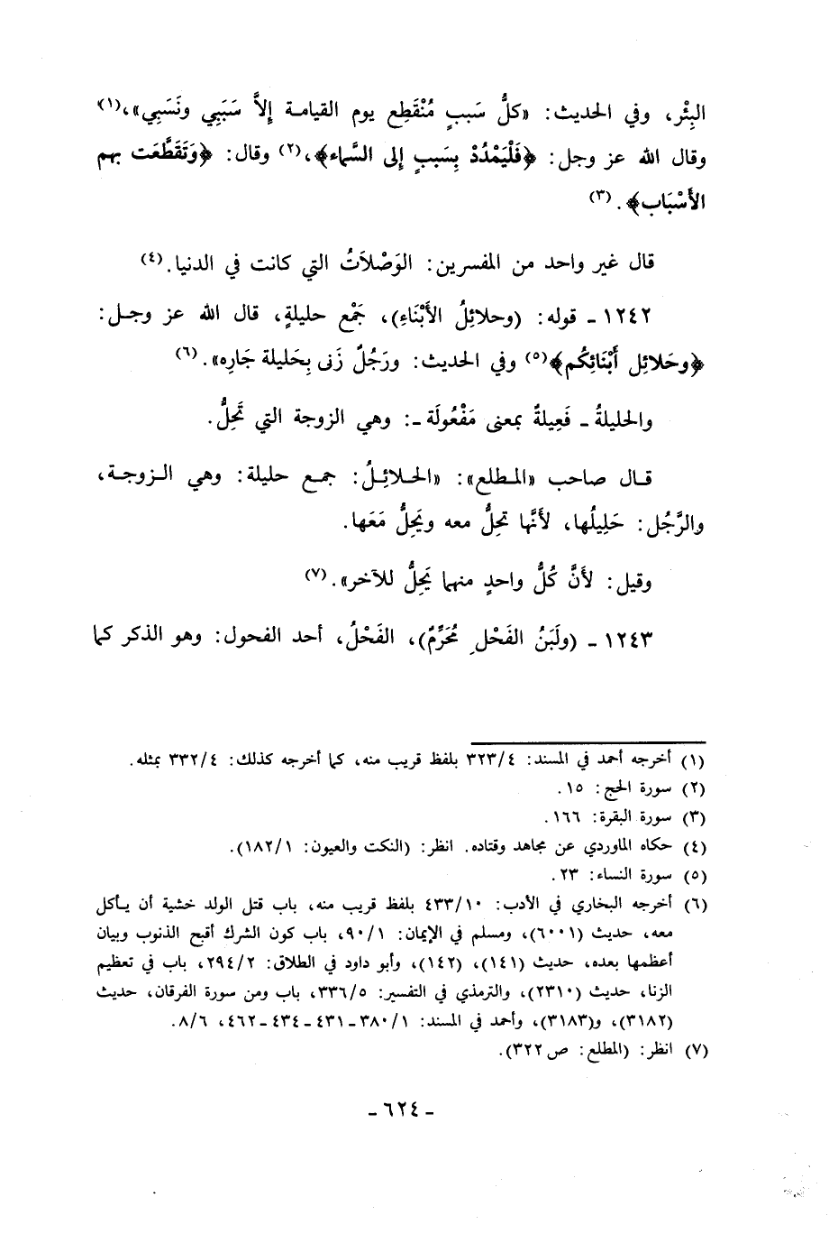 1242 - قوله: (وحلائِلُ الأَبْنَاءِ)، جَمْع حليلةٍ، قال الله عز وجل: {وَحَلَائِلُ أَبْنَائِكُمُ} (¬5) وفي الحديث: ورَجُلٌ زَنى بِحَليلة جَارِه". (¬6)