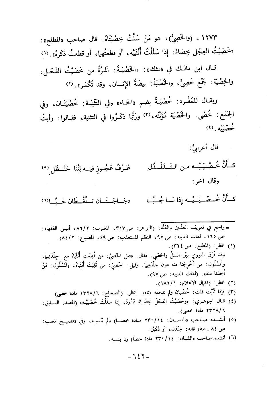(¬3) فإذا ثنيت قلت: خُصْيَان ولم تلحقها "تاء". انظر: (الصحاح: 6/ 1328 مادة خصى).