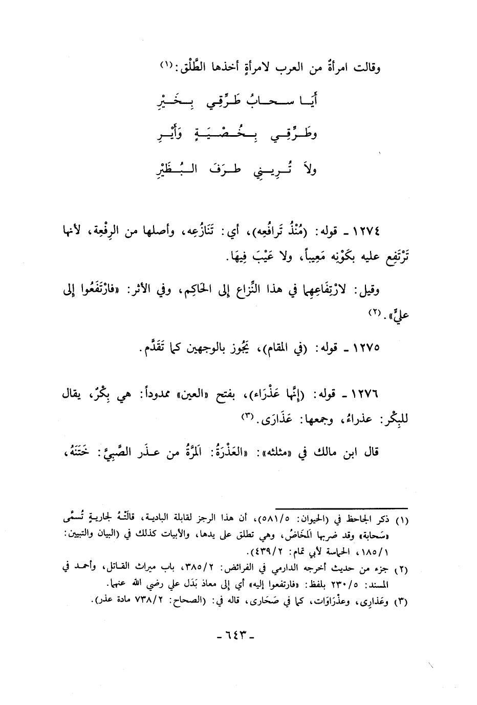(¬1) ذكر الجاحظ في (الحيوان: 5/ 581)، أن هذا الرجز لقابلة البادية، قالَتْهُ لجاريه تُسمى "سَحابة" وقد ضربها الَمخَاضُ، وهي تطلق على يدها، والأبيات كذلك في (البيان والتبيين: 1/ 185، الحماسة لأبي تمام: 2/ 439).