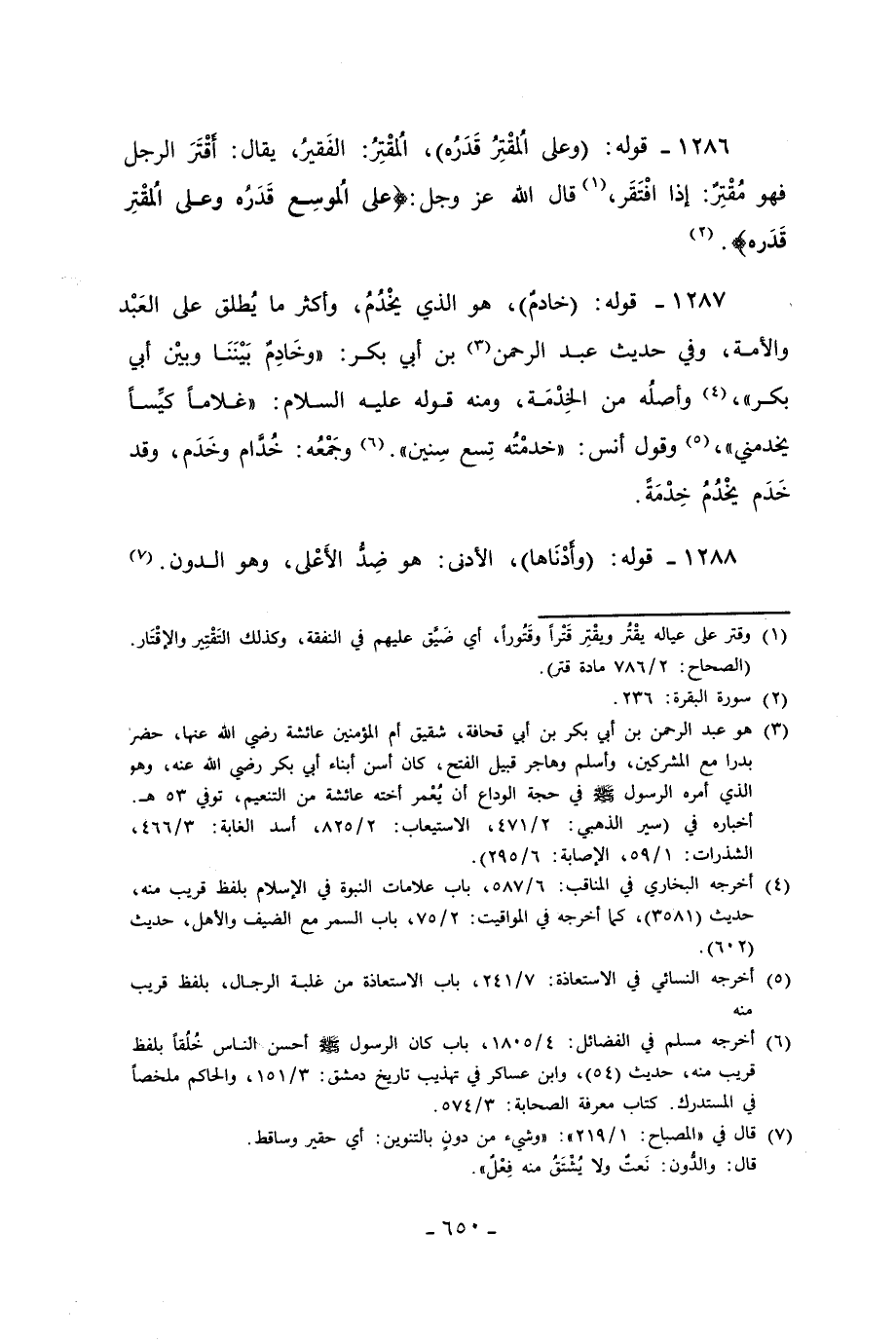 1287 - قوله: (خادمٌ)، هو الذي يخْدُمُ، وأكثر ما يُطلق على العَبْد والأمة، وفي حديث عبد الرحمن (¬3) بن أبي بكر: (وخَادِم بَيْنَنَا وبيْن أبي بكر"، (¬4) وأصلُه من الخِدْمَة، ومنه قوله عليه السلام: "غلاماً كيِّساً يخدمني"، (¬5) وقول أنس: "خدمْتُه تِسع سِنين". (¬6) وجَمْعُه: خُدَّام وخَدَم، وقد خَدَم يخْدُمُ خِدْمَةً.