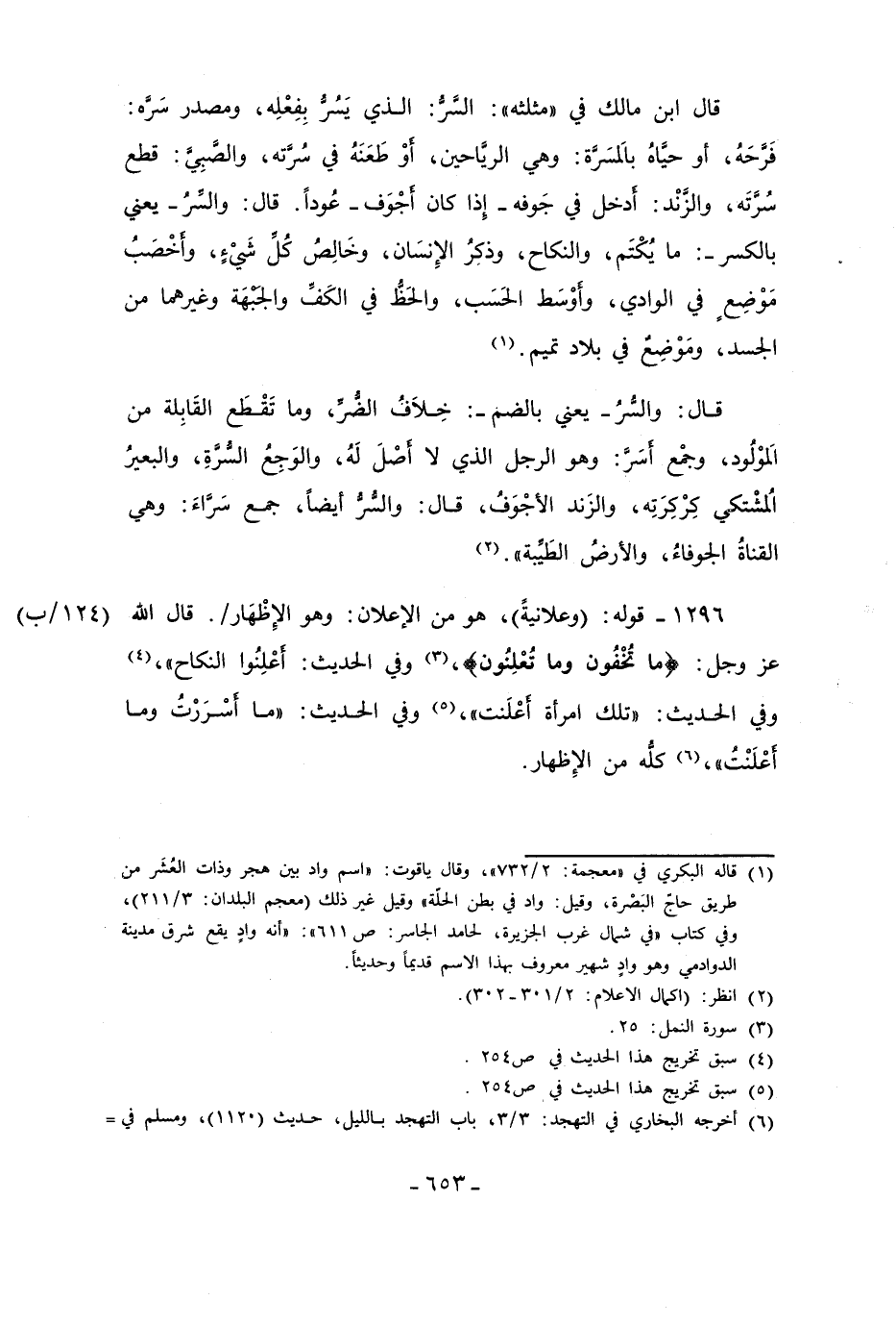 قال ابن مالك في "مثلثه": السَّرُّ: الذي يَسُرُّ بِفِعْلِه، ومصدر سَرَّه: فَرَّحَهُ، أو حيَّاهُ بالَمسَرَّة: وهي الريَّاحين، أوْ طَعَنَهُ في سُرته، والصَّبِيَّ: قطع سُرَّتَه، والزَّنْد: أدخل في جَوفه - إِذا كان أجْوَف - عُوداً. قال: والسِّرُ -يعني بالكسر -: ما يُكْتَم، والنكاح، وذكرُ الإِنسَان، وخَالِصُ كُلِّ شَيْءٍ، وأخْصَبُ مَوْضِع في الوادي، وأوْسَط الحَسَب، والحَظُّ في الكَف والجبهَة وغيرهما من الجسد، ومَوْضِعٌ في بلاد تميم. (¬1)