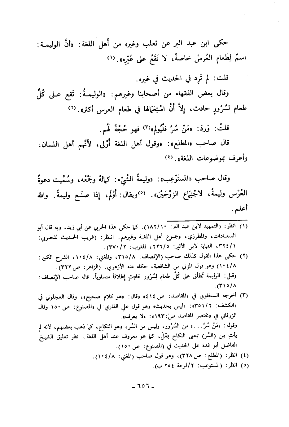 وقال بعض الفقهاء من أصحابنا وغيرهم: "الوليمةُ: تَقع على كُلِّ طعام لسُرورٍ حادث، إِلا أنَّ اسْتِعَمَالها في طعام العرس أكثر". (¬2)