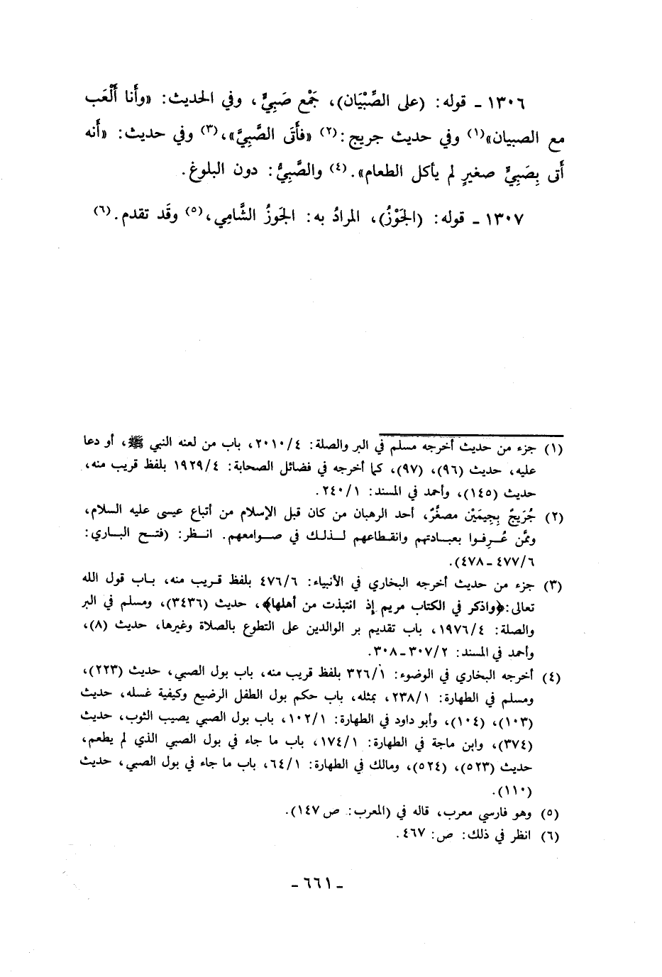 1306 - قوله: (على الصِّبْيَان)، جَمْع صَبِيٍّ، وفي الحديث: "وأنا ألْعَب مع الصبيان" (¬1) وفي حديث جريج: (¬2) (فأتي الصَّبِيَّ"، (¬3) وفي حديث: "أنه أتي بِصَبِيٍّ صغيرٍ لم يأكل الطعام". (¬4) والصَّبِيُّ: دون البلوغ.