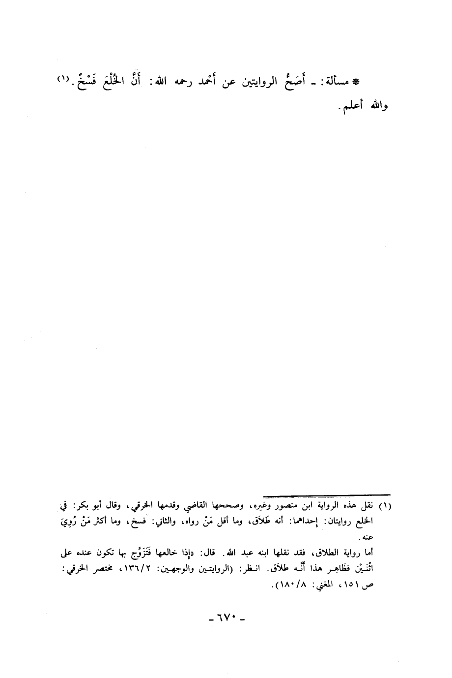 (¬1) نقل هذه الرواية ابن منصور وغيره، وصححها القاضي وقدمها الخرقي، وقال أبو بكر: في الخلع روايتان: إحداهما: أنه طَلاَق، وما أقل مَنْ رواه، والثاني: فسخ، وما أكثر مَنْ روِيَ عنه.