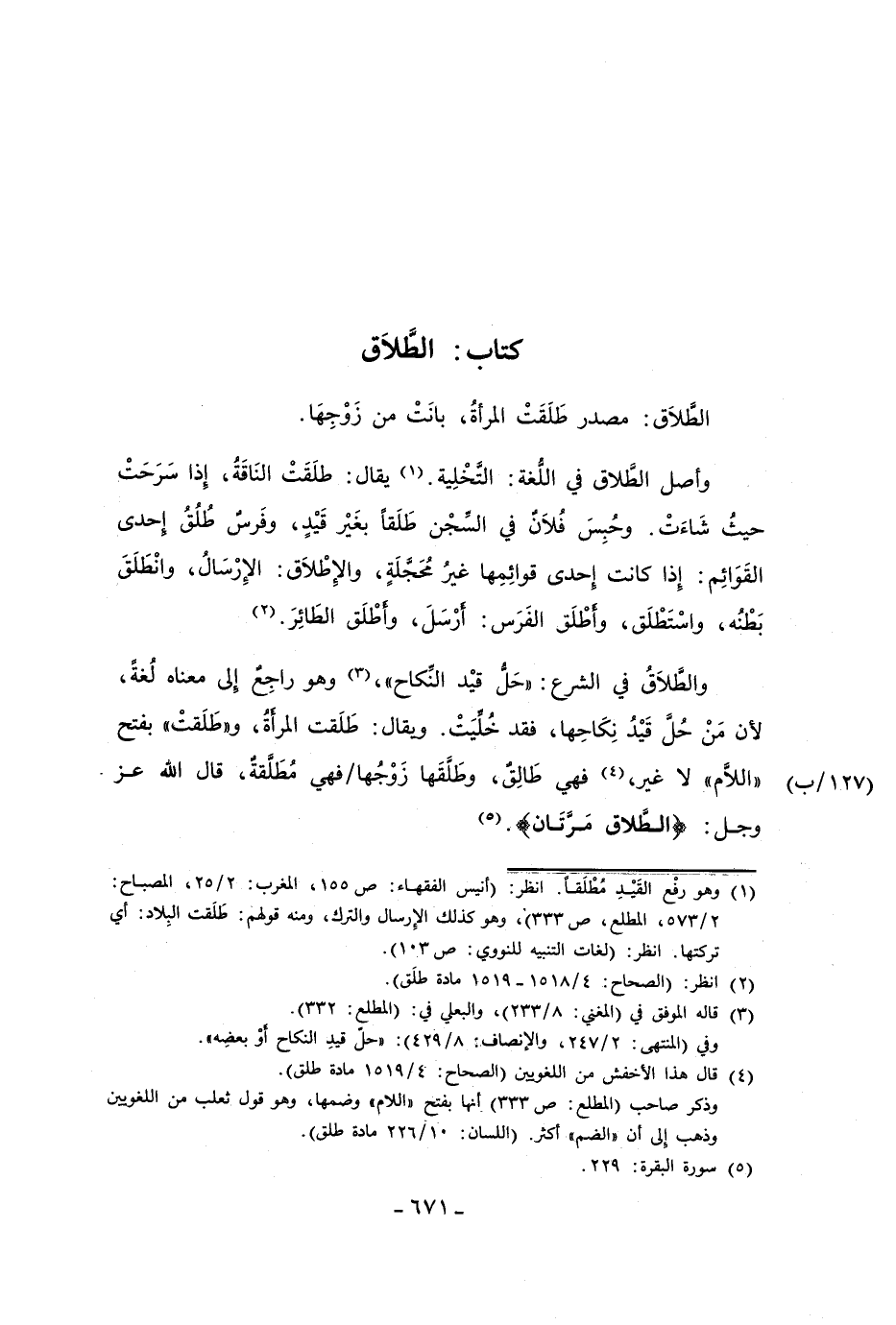 (¬1) وهو رفْع القَيْدِ فطْلَقاْ انظر (أنيس الفقهاء: ص 155، المغرب: 2/ 25، المصباح: 2/ 573، المطلع، ص 333)، وهو كذلك الإِرسال والترك، ومنه قولهم: طَلَقت البِلاد: أي تركتها. انظر: (لغات التنبيه للنووي: ص 103).