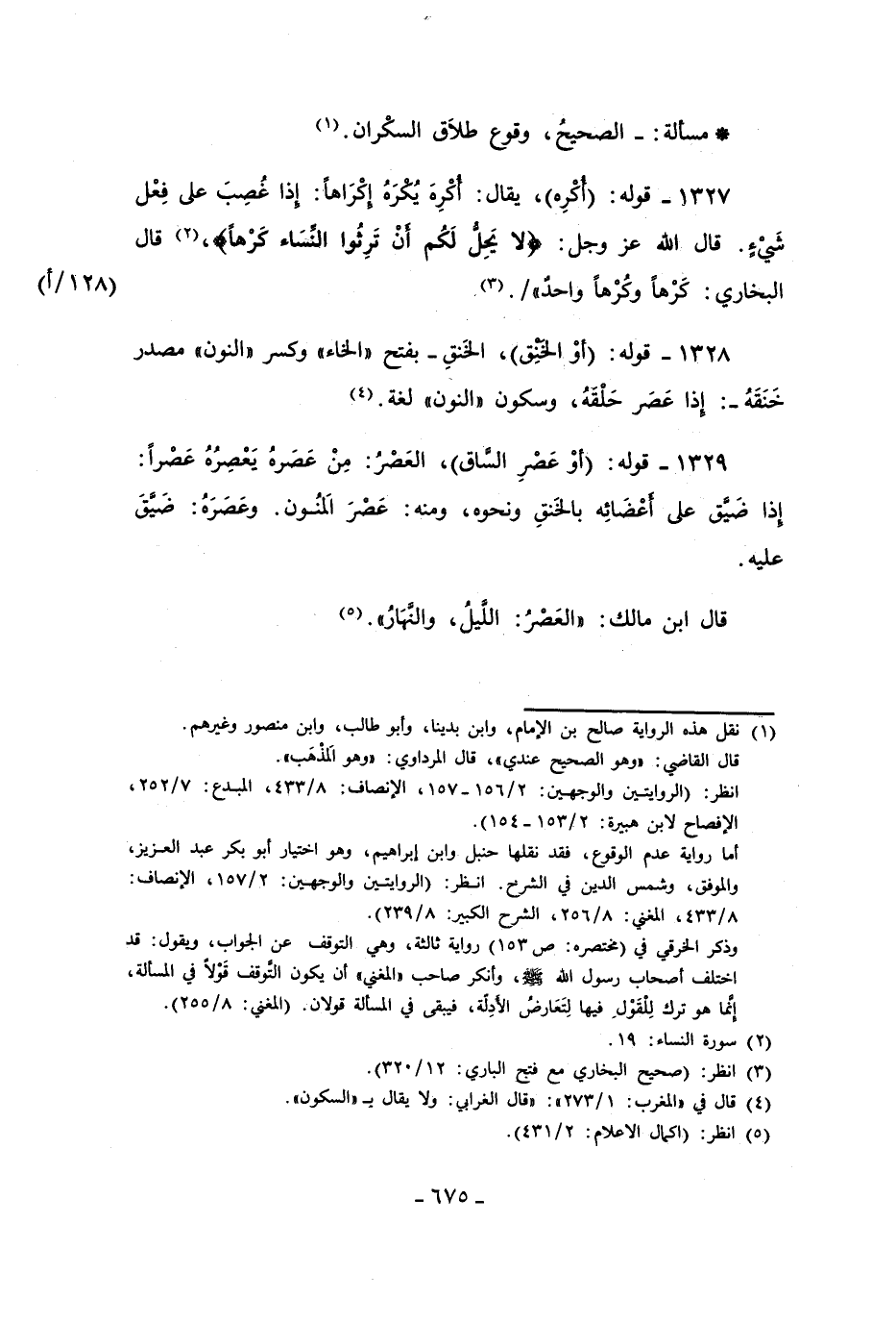 1329 - قوله: (أوْ عَصْرِ الساق)، العَصْرُ: مِنْ عَصَرهُ يَعْصِرُهُ عَصْرًا: إذا ضيَّق على أعْضَائِه بالخَنقِ ونحوه، ومنه: عَصْرَ الَمنُون. وعَصَرَهُ: ضيَّق عليه.