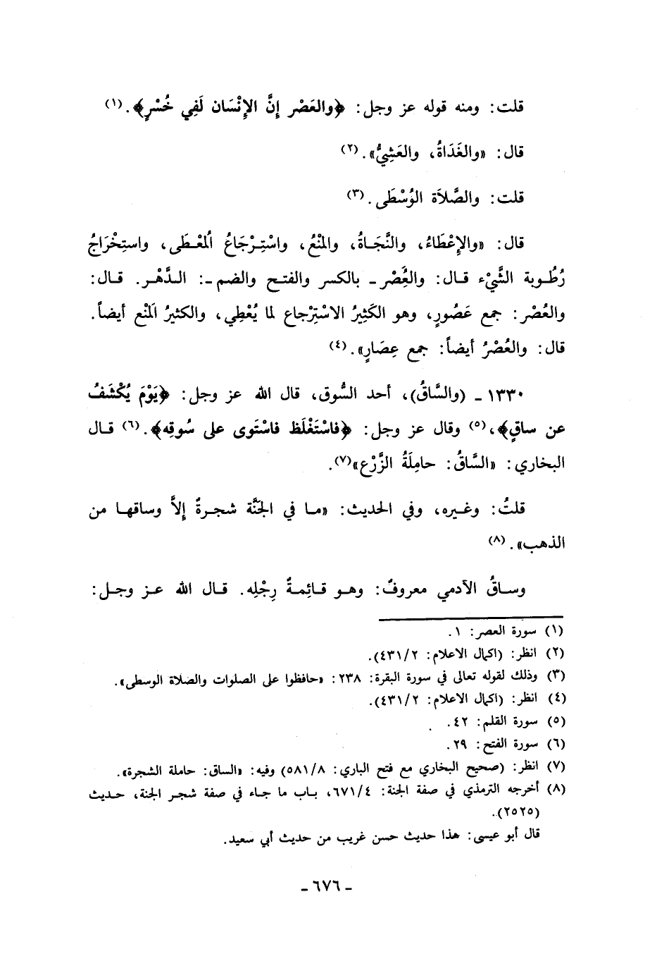 1330 - (والسَّاقُ)، أحد السُّوق، قال الله عز وجل: {يَوْمَ يُكْشَفُ عَنْ سَاقٍ} (¬5) وقال عز وجل: {فَاسْتَغْلَظَ فَاسْتَوَى عَلَى سُوقِهِ} (¬6) قال البخاري: (السَّاقُ: حامِلَةُ الزَّرْع" (¬7).