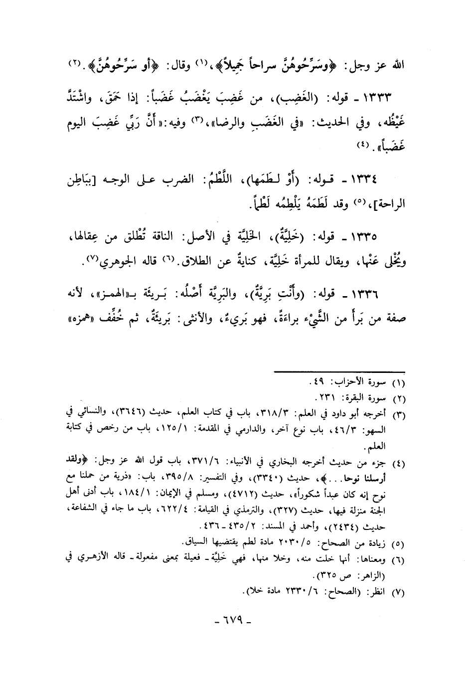 1336 - قوله: (وأنْتِ بَرِيَّةٌ)، والبَرِيَّة أصْلُه: بَريئَة بـ "الهمز"، لأنه صفة من بَرأ من الشَّيء براءَة، فهو بَريء، والأنثى: بَريئَةٌ، ثم خُفِّف "همزه"