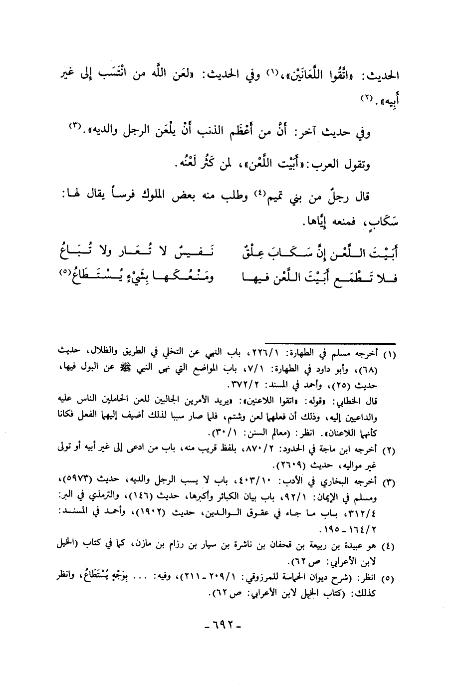 الحديث: "اتقُوا اللعَانَيْن"، (¬1) وفي الحديث: "لعَن الله من انْتَسَب إلى غير أبِيه". (¬2)
