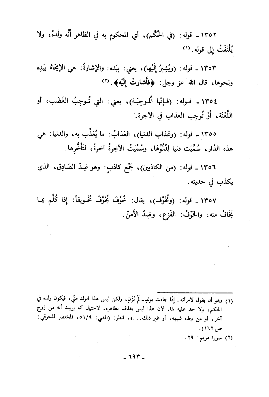 1353 - قوله: (وُيشِيرُ إلَيْها)، يعني: بِيَده: والإشارةُ: هي الإيحَاءُ بيَدِه ونحوها، قال الله عز وجل: {فَأَشَارَتْ إِلَيْهِ}. (¬2)
