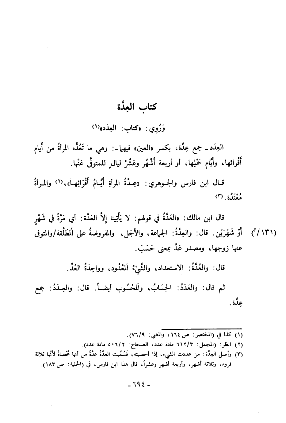 (¬3) وأصل العدة: من عددت الشيء، إذا أحصيته، فَسمِّيت العدِّةُ عِدةً من أنها محصاة لأَنها ثلاثة قروء، وثلانة أشهر، وأربعة أشهر وعشرًا، قال هذا ابن فارس، في (الحلية: ص 183).