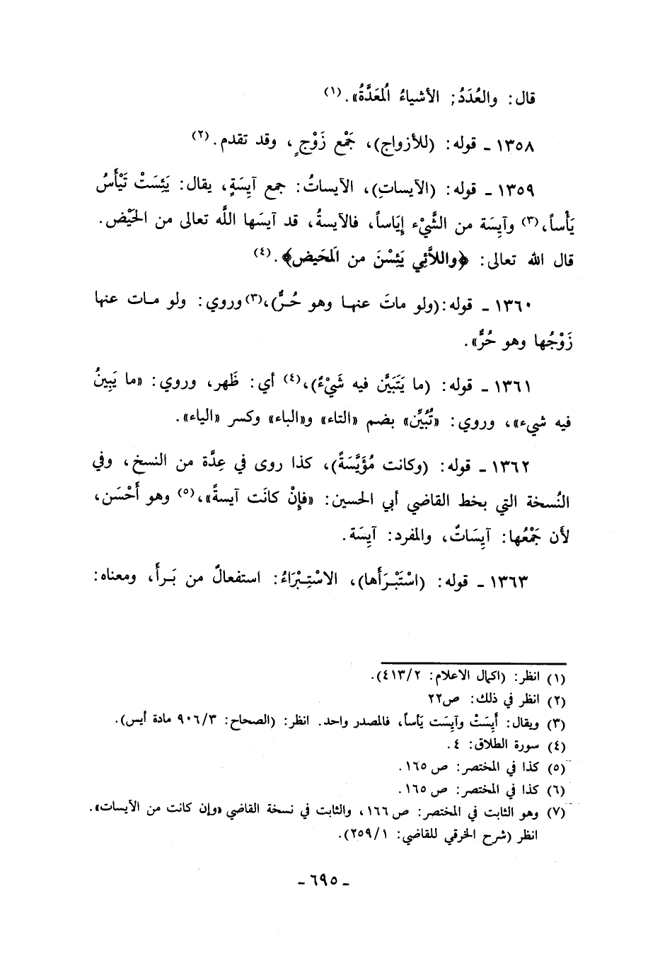 1362 - قوله: (وكانت مُؤيّسَةً)، كذا روى في عِدة من النسخ، وفي النُسخة التي بخط القاضي أبي الحسين: "فإنْ كانَت آيسةً"، (¬7) وهو أحْسَن، لأن جَمْعُها: آيِسَاتٌ، والمفرد: آيِسَة.