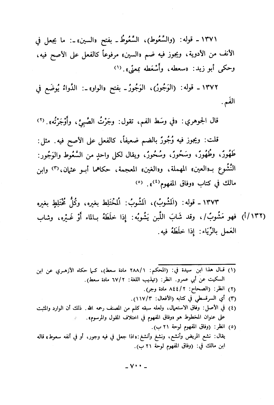 1371 - قوله: (والسّعُوط)، السّعُوطُ - بفتح "السين " -: ما يجعل في الأنف من الأدوية، ويجوز فيه ضم "السين" مرفوعًا كالفعل على الأصح فيه، وحكى أبو زيد: "سعطه، وأسْعَطه بمعنًى". (¬1)