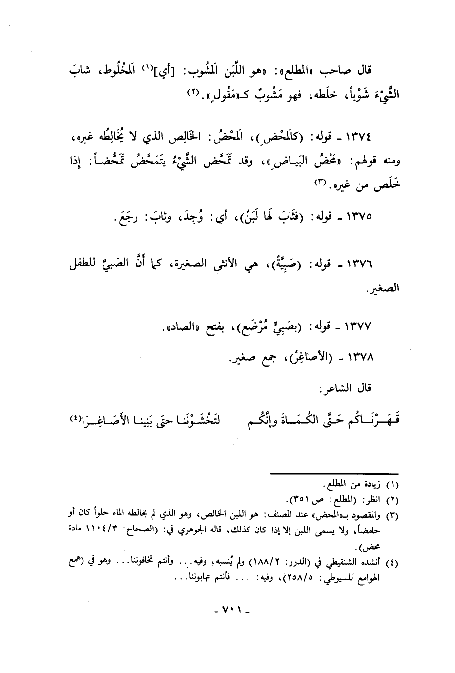 (¬3) والمقصود بـ "المحض" عند المصنف: هو اللبن الخالص، وهو الذي لم يخالطه الماء حلوًا كان أو حامضًا، ولا يسمى اللبن إلا إذا كان كذلك، قاله الجوهري في: (الصحاح: 3/ 1104 مادة محض).