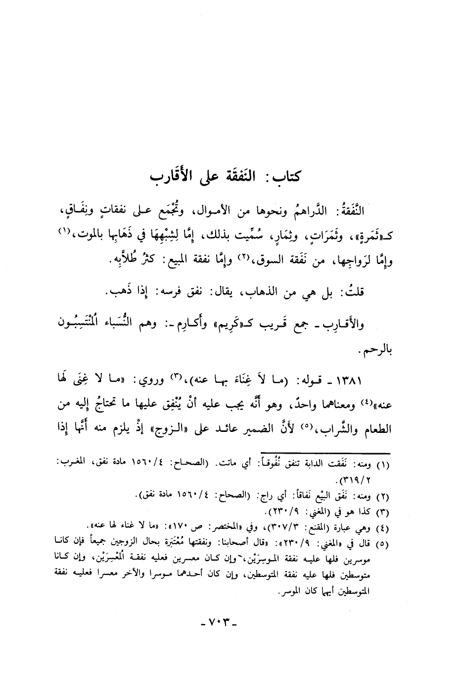 1381 - قوله: (ما لاَ غِنَاءَ بها عنه)، (¬3) وروي: "ما لا غِنَى لَها عنه " (¬4) ومعناهما واحدٌ، وهو أَده يجب عليه أنْ يُنْفِق عليها ما تحتاجُ إِليه من الطعام والشَراب، (¬5) لأَنَّ الضمير عائد على "الزوج" إذْ يلزم منه أنَها إِذا