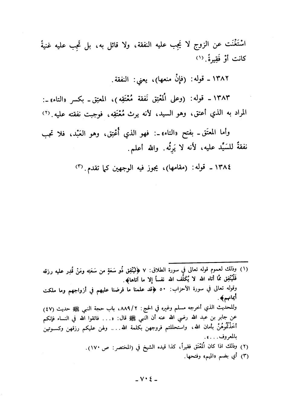 1383 - قوله: (وعلى المعْتِق نَفقة مُعْتَقِه)، المعتِق - بكسر "التاء" -: المراد به الذي أعتق، وهو السيد، لأنه يرث مُعْتَقِه، فوجبت نفقته عليه. (¬2)