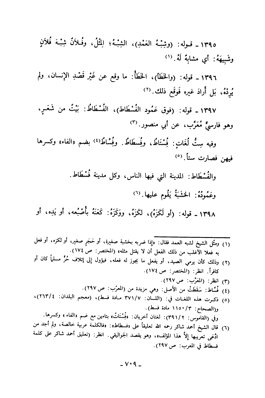 (¬6) قال الشيخ أحمد شاكر رحمه الله تعليقًا على "فسطاط": "فالكلمة عربية خالصة، ولم أجد من ادعَى تعريبها إلَّا هذا المؤلف"، وهو يقصد الجواليقي. انظر: (تعليق أحمد شاكر على كلمة فسطاط في المعرب: ص 297).