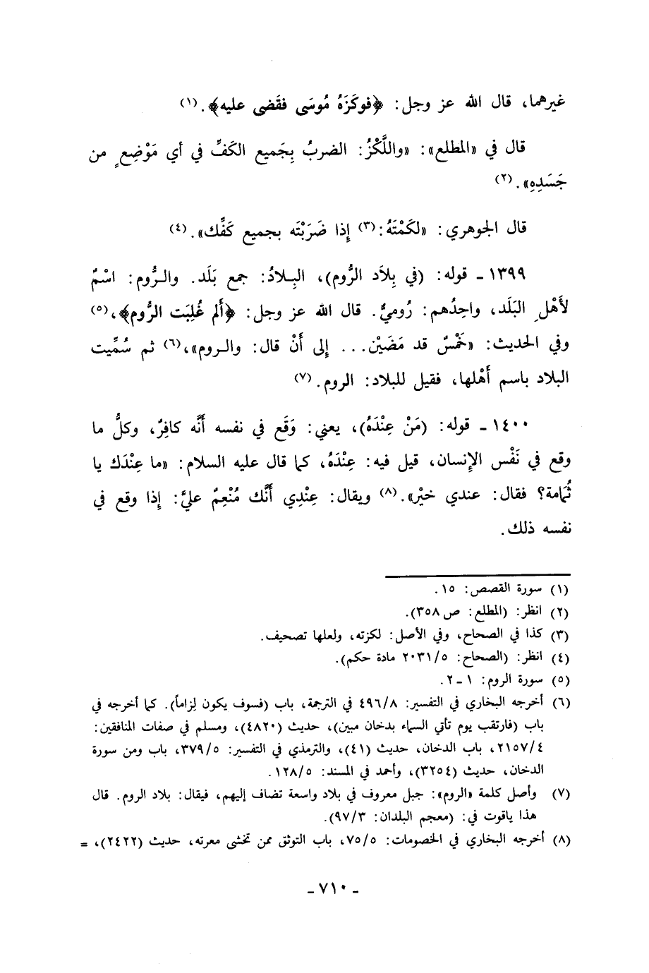 1399 - قوله: (في بِلاَد الرُّوم)، البِلادُ: جمع بَلَد. والرّوم: اسْمٌ لأَهْلِ البَلَد، واحِدُهم: رُومي. قال الله عز وجل: {الم (1) غُلِبَتِ الرُّومُ} (¬5). وفي الحديث: "خمس قد مَضَيْن ... إِلى أنْ قال: والروم"، (¬6) ثم سُمِّيت البلاد باسم أهْلها، فقيل للبلاد: الروم. (¬7)