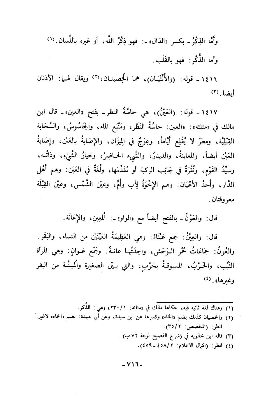 1416 - قوله: (والأُنْثَيَان)، هما الُخِصيتان، (¬2) ويقال لهما: الأذنان أيضا. (¬3)