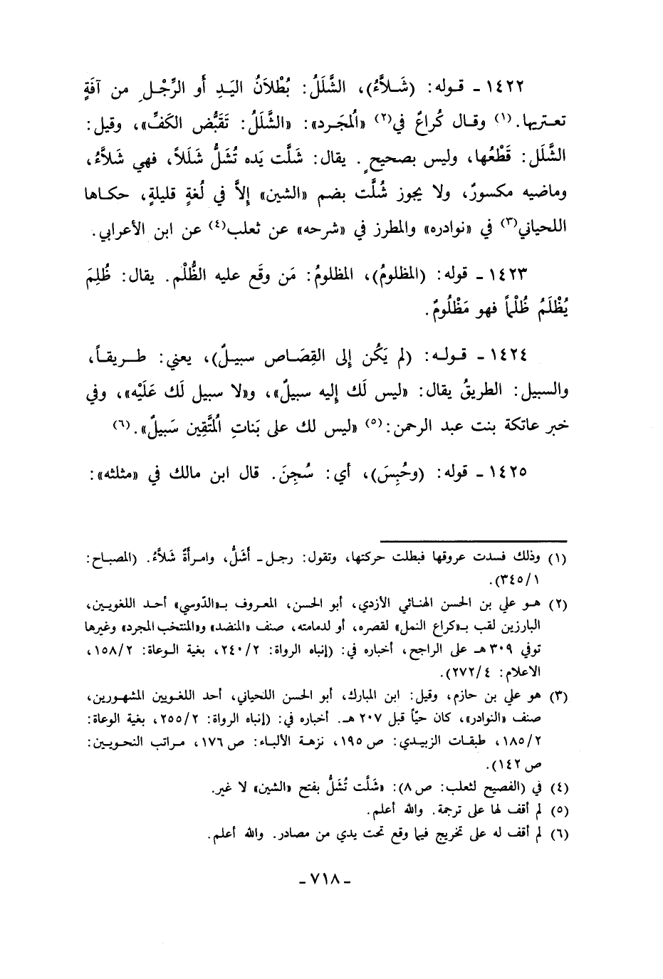 1422 - قوله: (شَلاَّءُ)، الشَّلَلُ: بُطْلاَنُ اليَدِ أو الرجْلِ من آفَةٍ تعتريها. (¬1) وقال كُراعٌ في (¬2) "المُجَرد": "الشَلَلُ: تَقَبُّض الكفّ"، وقيل: الشَّلَل: قَطْعُها، وليس بصحيح. يقال: شَلَّت يَده تُشَل شَلَلاً، فهي شَلَّاءُ، وماضيه مكسورٌ، ولا يجوز شُلَّت بضم "الشين" إلاَّ في لُغةٍ قليلةٍ، حكاها اللحياني (¬3) في "نوادره" والمطرز في "شرحه" عن ثعلب (¬4) عن ابن الأعرابي.