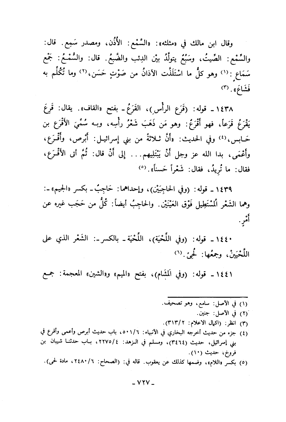 1438 - قوله: (قَرَع الرأْسِ)، القَرَعُ - بفتح "القاف". يقال: قَرعَ يَقْرَعُ قَرَعًا، فهو أقْرَعٌ: وهو مَن ذَهَبَ شَعْرُ رأْسِه، وبه سُميَ الأَقْرَع بن حَابس، (¬4) وفي الحديث: "أَنَّ ثلاثةً من بني إِسرائيل: أَبْرص، وأَقْرَع، وأَعْمَى، بدا الله عز وجل أَنْ يَبْتَلِيهم ... إِلى أنْ قال: ثُمَّ أتي الأَقْرَع، فقال: ما تُرِيدُ، فقال: شَعْرًا حَسنًا". (¬5)