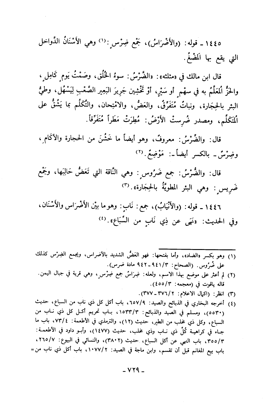1445 - قوله: (والأَضْرَاسُ)، جَمْع ضِرْسٍ: (¬1) وهي الأَسْنَانُ الدَّواخل التي يقع بها الَمضْغُ.