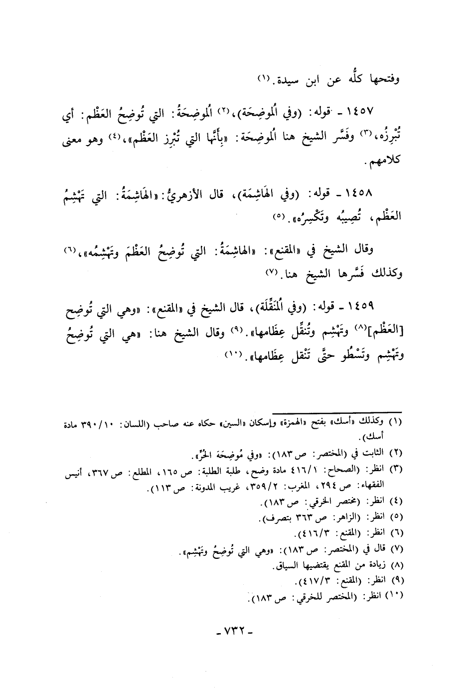 1457 - قوله: (وفي الُموضِحَة)، (¬2) الُموضِحَةُ: التي تُوضِحُ العَظْم: أي تُبْرِزُه، (¬3) وفَسَّر الشيخ هنا الُموضِحَة: "بِأَنَّها التي تُبْرِز العَظْم"، (¬4) وهو معنى