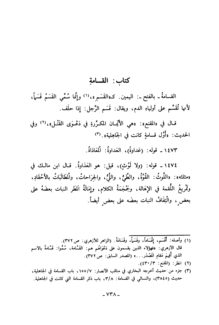 1474 - قوله: (ولا لَوْثٍ)، قيل: هو العَدَاوةُ. قال ابن مالك في "مثلثه": "اللَّوثُ: القُوَّةُ، والطَّيُّ، واللَّيُّ، والجِرَاحاتُ، والُمطَالَبَاتُ بالأَحْقَادِ، وتَمْريغُ اللُّقمة في الإِهَالة، وجَمْجَمَةُ الكلام، وإِمَالَةُ الَمطَر النبات بعضَهُ على بعض، والْتِفَافُ النبات بعضَه على بعضٍ أيضًا.