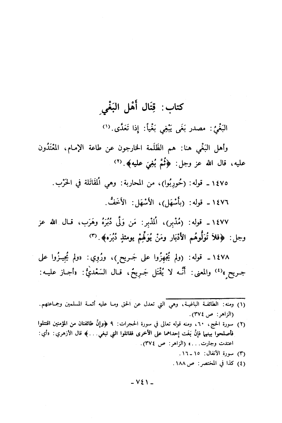 (¬2) سورة الحج، 60، ومنه قوله تعالى في سورة الححرات: 9 {وَإِنْ طَائِفَتَانِ مِنَ الْمُؤْمِنِينَ اقْتَتَلُوا فَأَصْلِحُوا بَيْنَهُمَا فَإِنْ بَغَتْ إِحْدَاهُمَا عَلَى الْأُخْرَى فَقَاتِلُوا الَّتِي تَبْغِي ... } قال الأزهري: "أي: اعتدت وجارت ... " (الزاهر: ص 374).