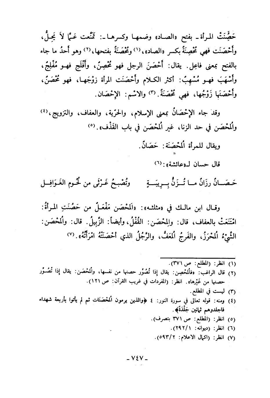 حَصُنَتْ المرأة - بفتح "الصاد" وضمها وكسرها -: تَمَنَّعت عَمَّا لَا يَحِلُّ، وأَحْصَنَت فهي مُحْصِنَةٌ بكسر "الصاد"، (¬1) ومُحْصَنَةٌ بفتحها، (¬2) وهو أَحدُ ما جاء بالفتح بمعنى فاعِل. يقال: أَحْصَنَ الرجل فهو مُحْصِنٌ، وأَفْلَج فهو مُفْلِجٌ، وأَسْهَبَ فهو مُسْهِبٌ: أكثر الكلام وأَحْصَنَت المرأة زوْجَها، فهو مُحْصَنٌ، وأَحْصَنها زَوْجُها، فهي مُحْصَنَةٌ. (¬3) والاسْم: الإِحْصَان.