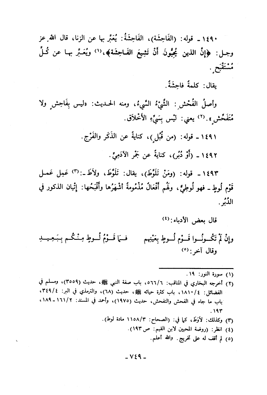 1490 - قوله: (الفَاحِشَة)، الفَاحِشَةُ: يُعَبَّر بها عن الزنا، قال الله عز وجل: {إِنَّ الَّذِينَ يُحِبُّونَ أَنْ تَشِيعَ الْفَاحِشَةُ}، (¬1) وُيعَبَّر بها عن كُلِّ مُسْتَقْبَحٍ.