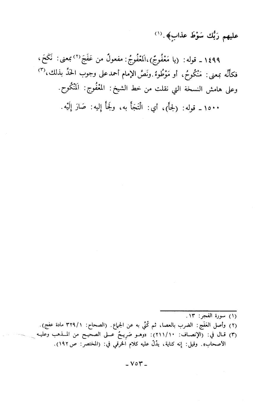 1499 - قوله: (في مَعْفُوجٌ)، الَمعْفُوجُ: مفعولٌ من عَفَجَ (¬2) بمعنى: نَكَحَ، فكأَنَّه بمعنى: مَنْكُوحُ، أو مَوْطُوءٌ. ونَصَّ الإمام أحمد على وجوب الحَدِّ بذلك، (¬3) وعلى هامش النسخة التي نقلت من خط الشيخ: المعْفُوج: المَنْكُوح.