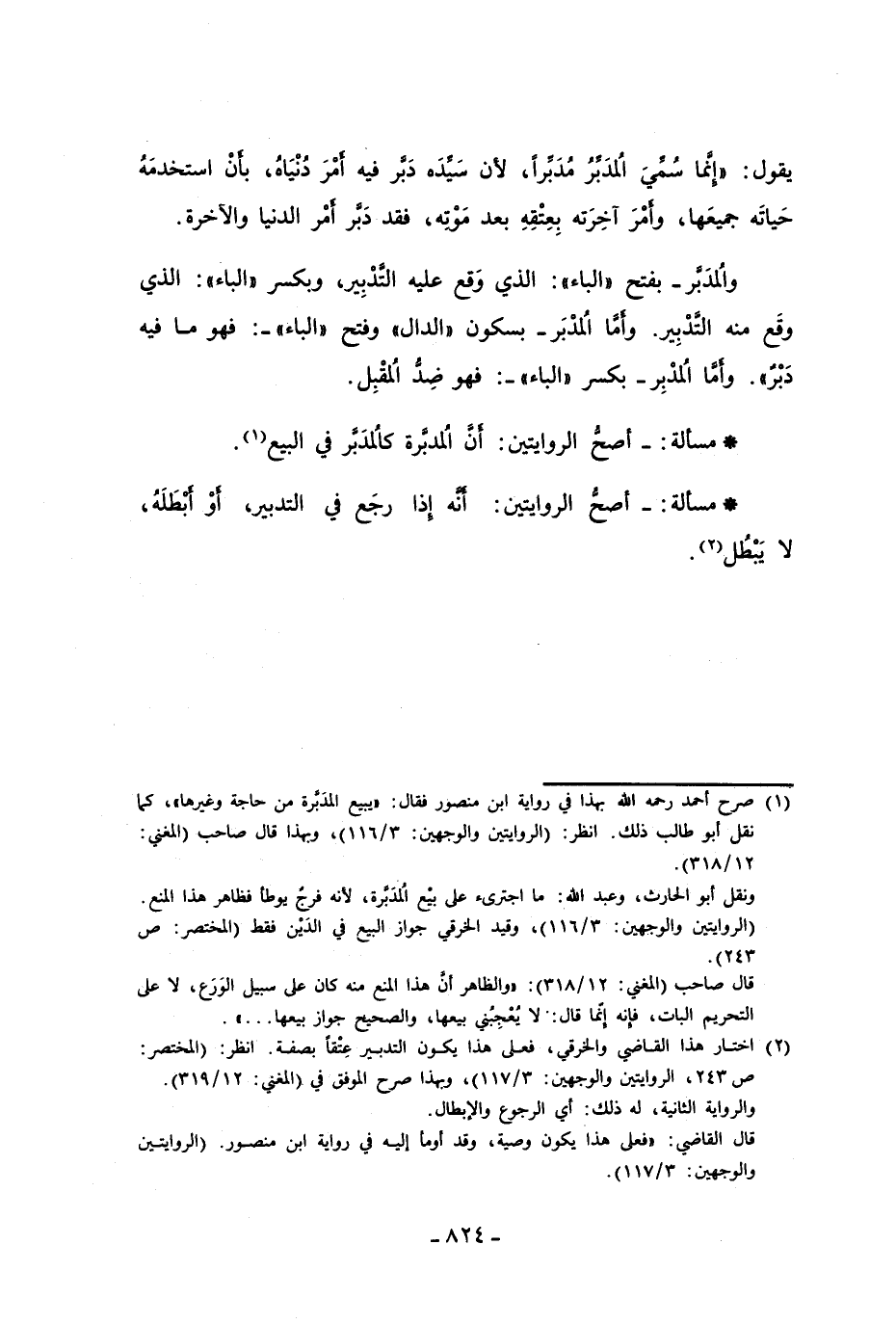 (¬2) اختار هذا القاضي والخرقي، فعلى هذا يكون التدبير عِتْقًا بصفة. انظر: (المختصر: ص 243، الروايتين والوجهين: 3/ 117)، وبهذا صرح الموفق في (المغني: 12/ 319). والرواية الثانية، له ذلك: أي الرجوع والإبطال.