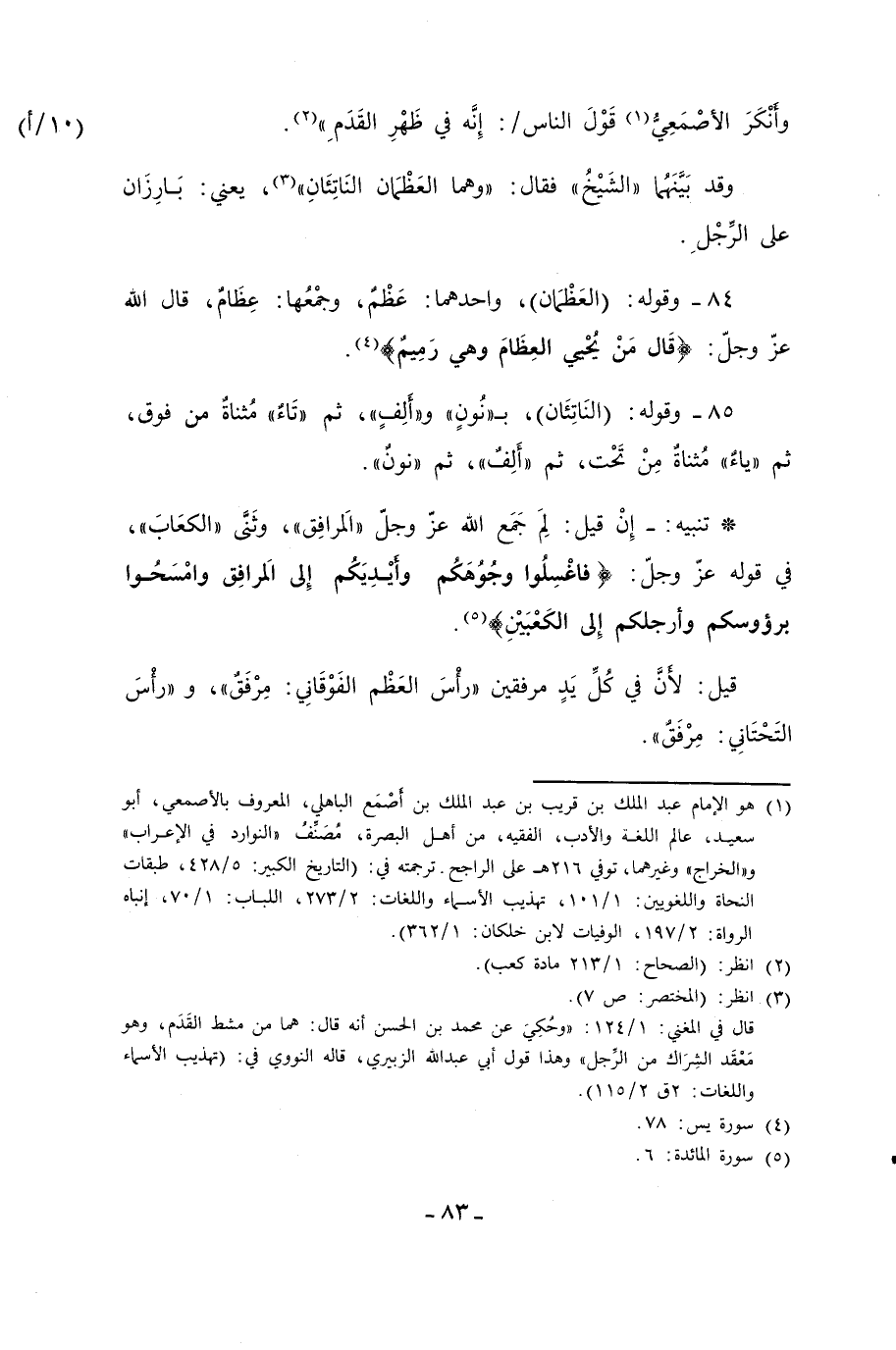 (¬1) هو الإمام عبد الملك بن قريب بن عبد الملك بن أصمَع الباهلي، المعروف بالأصمعي، أبو سعيد، عالم اللغة والأدب، الفقيه، من أهل البصرة، مُصَنِّفٌ "النوارد وفي الإعراب" و"الخراج" وغيرهما، توفي 216 هـ على الراجح. ترجمته في: (التاريخ الكبير: 5/ 428، طبقات النحاة واللغويين: 1/ 101، تهذيب الأسماء واللغات: 2/ 273، اللباب: 1/ 70، إنباه الرواة: 2/ 197، الوفيات لابن خلكان: 1/ 362).