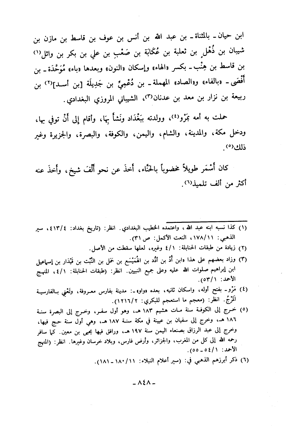 ابن حيان - بالمثناة - بن عبد الله بن أنس بن عوف بن قاسط بن مازن بن شيبان بن ذُهْل بن ثعلبة بن عُكَابَة بن صَعْبِ بن علي بن بكر بن وائل (¬1) بن قاسط بن هِنب - بكسر "الهاء" وإسكان "النون" وبعدها "باء" مُوَحَّدَة - بن أفْضَى - "بالفاء" و"الصاد" المهملة - بن دُعْمِيِّ بن جَدِيلَة [بن أسد] (¬2) بن ربيعة بن نزار بن معد بن عدنان (¬3)، الشيباني المروزي البغدادي.