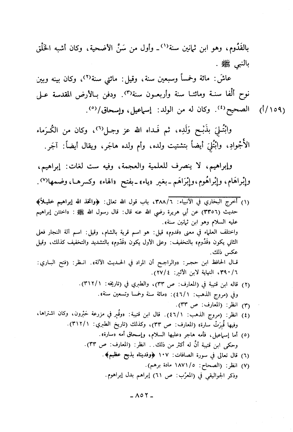 (¬1) أخرج البخاري في الأنبياء: 6/ 388، باب قود الله تعالى: {وَاتَّخَذَ اللَّهُ إِبْرَاهِيمَ خَلِيلًا} حديث (3356) عن أبي هريرة رضي الله عنه قال: قال رسول الله - صلى الله عليه وسلم -: "اختتن إبراهيم عليه السلام وهو ابن ثمانين سنة".