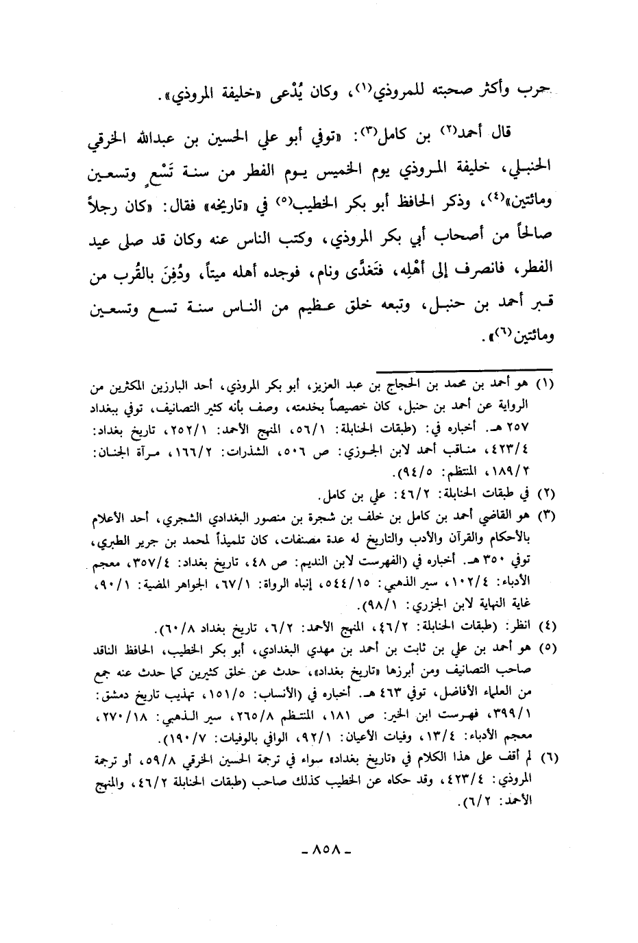 (¬6) لم أقف على هذا الكلام في "تاريخ بغداد" سواء في ترجمة الحسين الخرقي 8/ 59، أو ترجمة المروذي: 4/ 423، وقد حكاه عن الخطيب كذلك صاحب (طبقات الحنابلة 2/ 46، والمنهج الأحمد: 2/ 6).