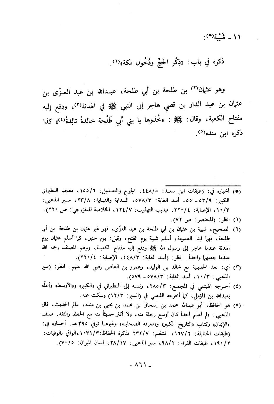 (¬2) الصحيح، شيبة بن عثمان بن أبي طلحة بن عبد العزّى، فهو غير عثمان بن طلحة بن أبي طلحة، فهما ابنا العمومة، أسلم شيبة يوم الفتح، وقيل: يوم حنين، كما أسلم عثمان يوم الهدنة عندما هاجر إلى رسول الله - صلى الله عليه وسلم - ودفع إليه مفتاح الكعبة، ووهم المصنف رحمه الله عندما جعلهما واحدًا. انظر: (أسد الغابة: 3/ 448، الإصابة: 4/ 220).