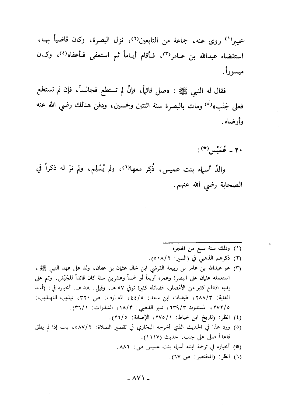 فقال له النبي - صلى الله عليه وسلم -: "صل قائمًا، فإن لم تستطع فجالسًا، فإن لم تستطع فعلى جَنْب" (¬5) ومات بالبصرة سنة اثنتين وخمسين، ودفن هنالك رضي الله عنه وأرضاه.